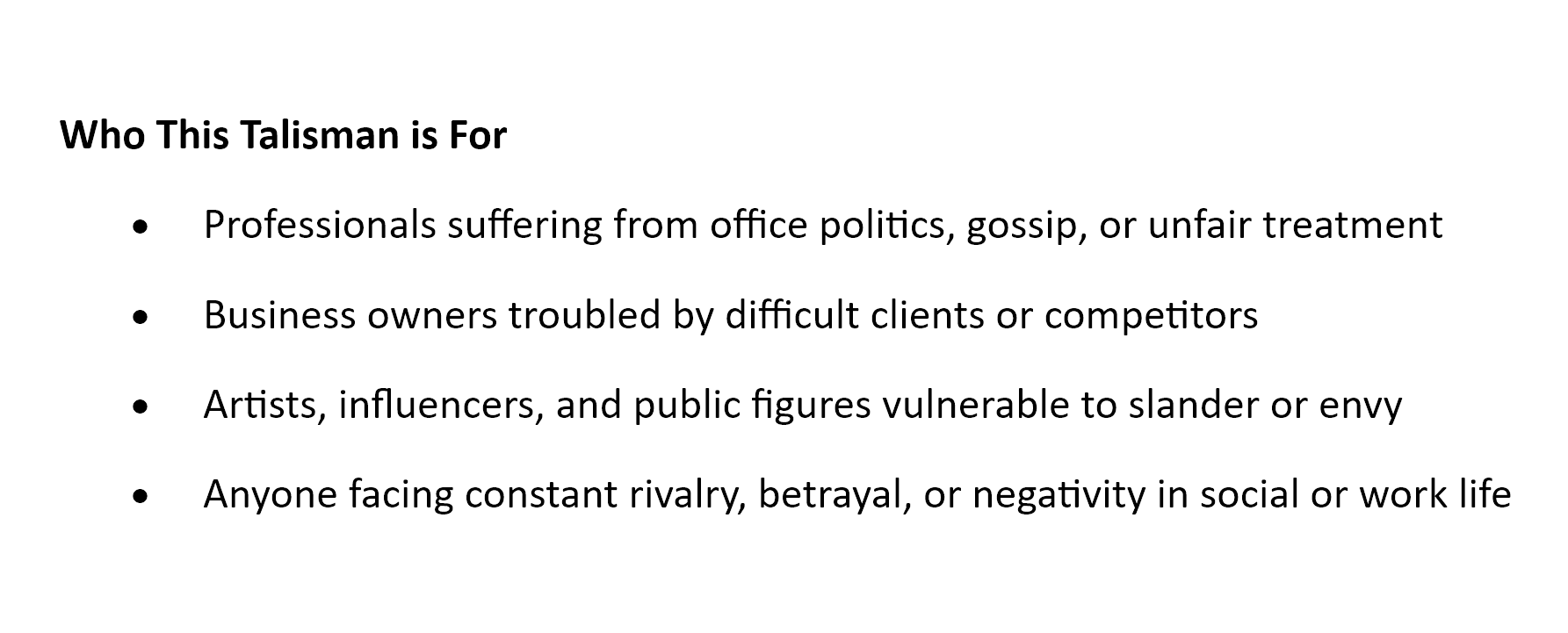 This talisman is particularly effective when the “petty person” is a specific, tangible figure—such as a superior, coworker, or client—making it highly practical for the workplace, business dealings, and social settings.