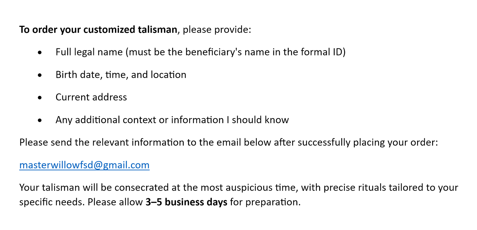 To order your customized talisman, please provide: